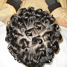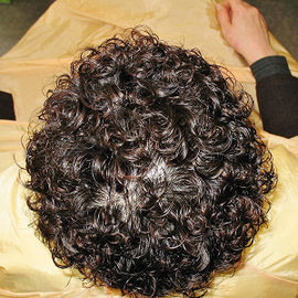 ロットアウトをすすぐと、似ても似つかぬ雰囲気に変わります。弱いパーマしか行わない美容師さんが見ると、かかり過ぎのチリチリのパーマに見えるのかもしれません。ところが紹介したハンドブローのかかり具合はこの状態で、これからドライヤーで水気を飛ばし、手グシで成形したものなのです。